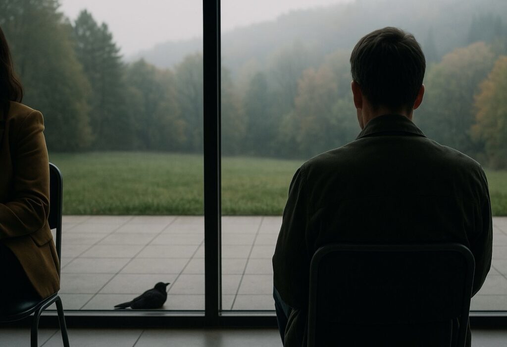Verőfényben, a kristályosra sikált törésálló üvegen keresztül jól látható a közeli erdő. A doki és a nyomozó velem szemben ülnek. Oldalt, mindnyájunktól a szabályban előírt távolságra, a tolmácsnő unja a banánt. Jobb időket is megélt negyvenesnek látszik. Amolyan divatjamúlt repi-hosztessz. Úgymond, „egy istállóból való lovak” lennénk. Ezt ő is érzi. Közömbös képpel mélázik, de éber szemei független életet élnek; a feladatra koncentrálnak. Szakmai ártalom. A nyomozó nem olyan, mint a filmbéli kollégái. Ha nem mondják, hogy az, tőlem akárki lehetne. Itt dolgozó, szabadnapján idetévedt ápoló, vagy osztályáról elkódorgott öngyilkosjelölt borderlineos. Viszont a doki jelenléte nagyon sokat számít. Megnyugtat. Elhízott, ősz hajú ember. Csak úgy ontja magából a nyugalmat! A nyomingert láthatóan feszélyezteti, hogy nem esik tőle hasra. Legbelül valahol ezt élvezem is.