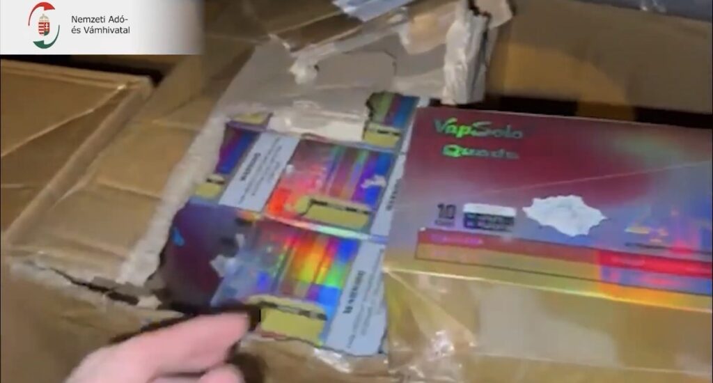 A két érintett járműben további 2 601 darab ízesített, eldobható elektromos cigarettát találtak. Ezeken sem volt magyar zárjegy, és a tulajdonosok nem tudták megmondani, honnan származnak a termékek.